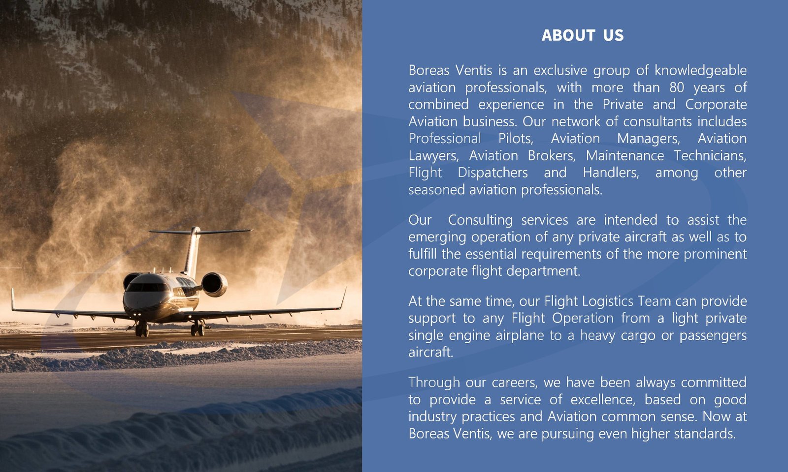 At Boreas Ventis our Corporate Aviation Consulting team, can guide you through the complete enterprise of your Aircraft Ownership. From aircraft Evaluation and Selection, through aircraft Completion, Modification or Pre-Buy Inspection.